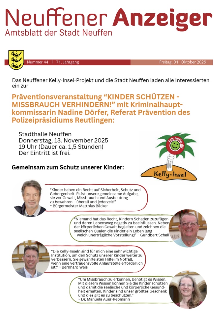 Zum AntragsformularKelly-Insel ist ein Projekt der Kommunalen Kriminalprävention und erhielt den DEUTSCHEN FÖRDERPREIS für Kriminalprävention, verliehen durch den Bundespräsidenten 2005.